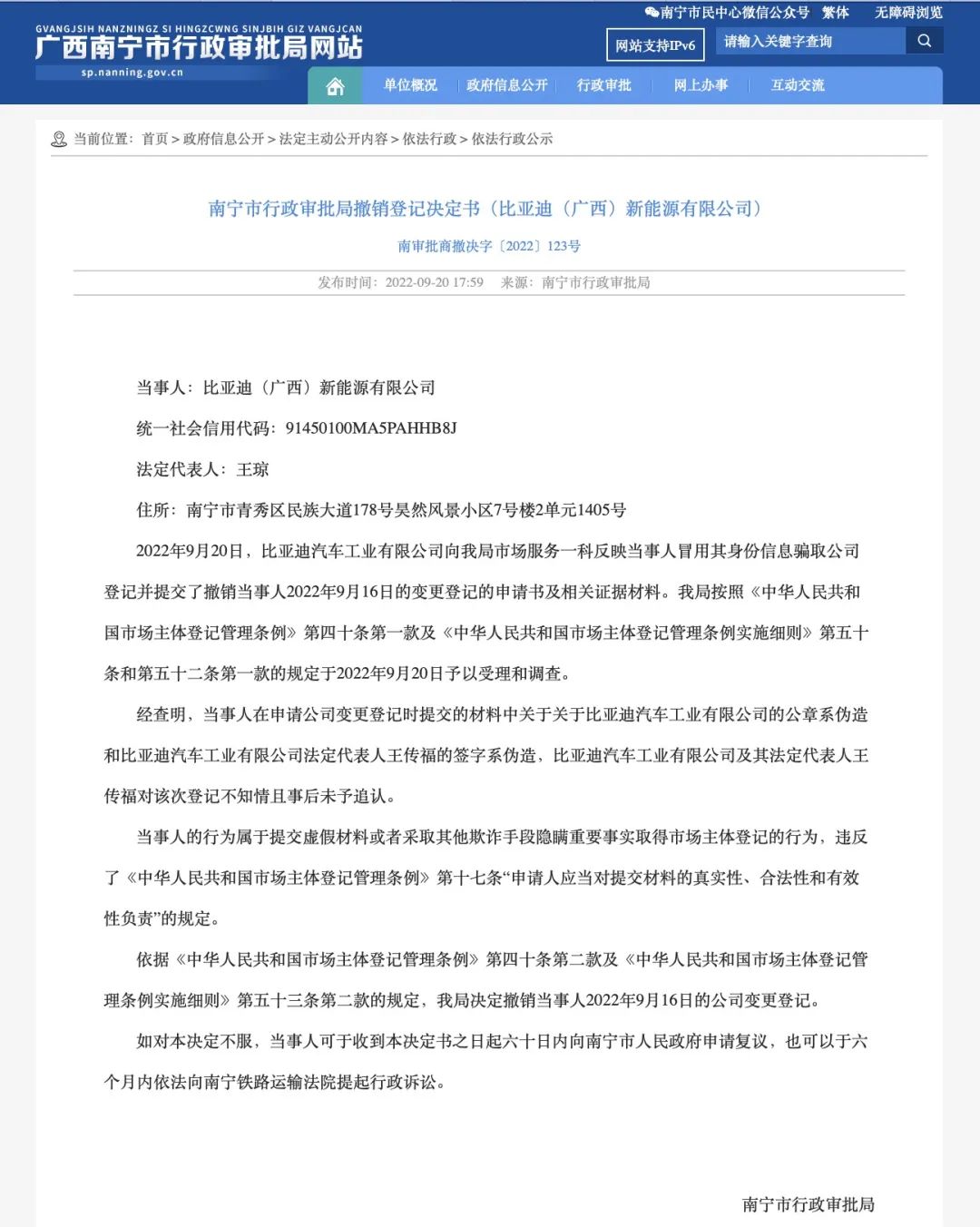 據(jù)廣西南寧市行政審批局網(wǎng)站信息,9月20日比亞迪汽車工業(yè)有限公司(以下簡稱“比亞迪汽車工業(yè)”)反映,南寧小重政公司提交的公章和王傳福的簽字均為偽造,因此9月16日的公司變更登記被取消,比亞迪向媒體表示對于此次“碰瓷”事件已報(bào)案。