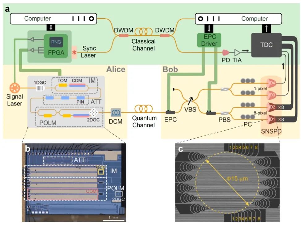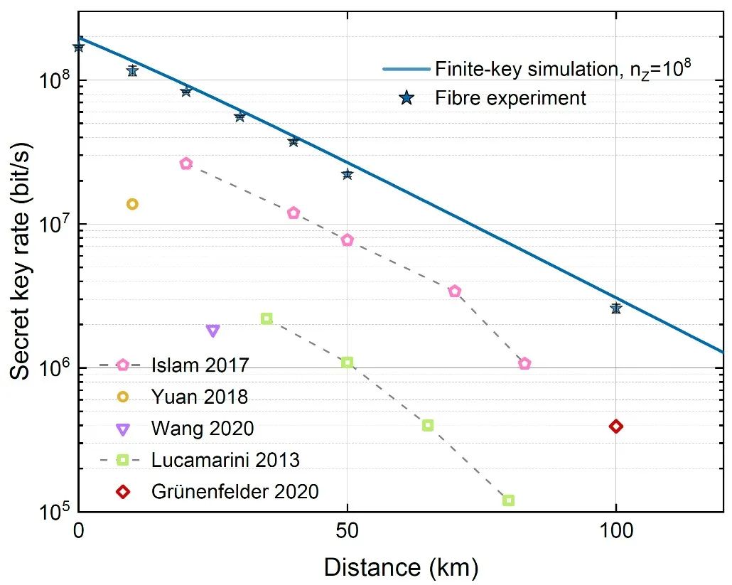依托中國科學(xué)技術(shù)大學(xué)組建的中科院量子信息與量子科技創(chuàng)新研究院潘建偉、徐飛虎等與上海微系統(tǒng)所、濟(jì)南量子技術(shù)研究院、哈爾濱工業(yè)大學(xué)等單位的科研人員合作,通過發(fā)展高保真度集成光子學(xué)量子態(tài)調(diào)控、高計(jì)數(shù)率超導(dǎo)單光子探測等關(guān)鍵技術(shù),首次在國際上實(shí)現(xiàn)百兆比特率的實(shí)時(shí)量子密鑰分發(fā),實(shí)驗(yàn)結(jié)果將此前的成碼率紀(jì)錄提升一個(gè)數(shù)量級。該成果于3月14日在線發(fā)表于國際著名學(xué)術(shù)期刊《自然·光子學(xué)》雜志 [Nature Photonics (2023)]。