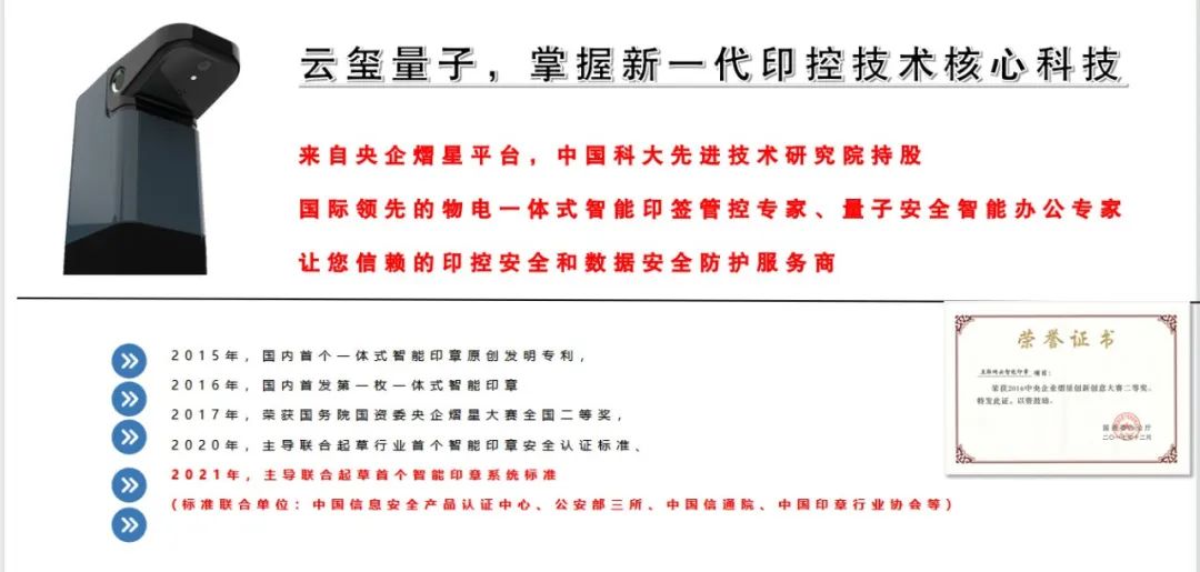 2020年,云璽量子聯(lián)合中國信息安全產(chǎn)品認(rèn)證中心、公安部三所、信通院、中國印章行業(yè)協(xié)會(huì),主導(dǎo)起草了行業(yè)首個(gè)智能印章安全標(biāo)準(zhǔn)和產(chǎn)品標(biāo)準(zhǔn)。標(biāo)準(zhǔn)的發(fā)布,大力推動(dòng)了智能印章行業(yè)標(biāo)準(zhǔn)化、產(chǎn)業(yè)化發(fā)展。標(biāo)志著千年傳統(tǒng)印章的智能化變革升級(jí),進(jìn)入智能印章時(shí)代。