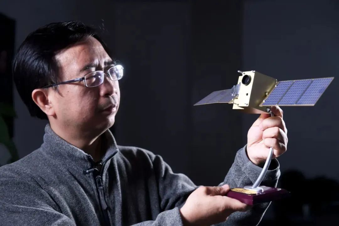 潘建偉在中國科學(xué)技術(shù)大學(xué)的辦公室內(nèi)與“墨子號(hào)”量子衛(wèi)星模型合影