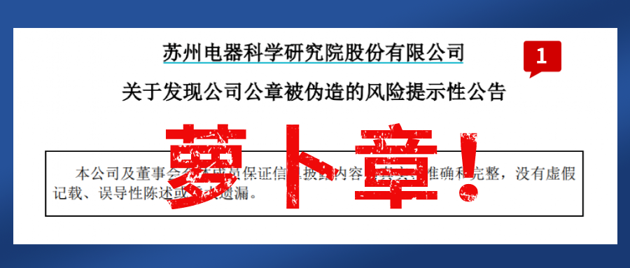 又有上市公司官方通報(bào)出現(xiàn)“蘿卜章”!電科院(300215)繼“父子反目”內(nèi)斗搶章事件后,又突然驚現(xiàn)“蘿卜章”新劇情。9月18日晚間,電科院發(fā)布關(guān)于發(fā)現(xiàn)公司公章被偽造的風(fēng)險(xiǎn)提示性公告稱,9月15日在新老管理層交接時(shí)發(fā)現(xiàn)一枚涉嫌偽造的公司公章,遂向公安機(jī)關(guān)報(bào)警。作為電器檢測行業(yè)龍頭,電科院…