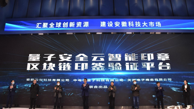 在12月中旬舉辦的安徽科技大市場科技成果轉化交易會上,中國電信安徽公司、中電信量子科技有限公司、天翼電子商務有限公司、安徽云璽科技有限公司聯(lián)合研發(fā)的“量子安全云智能印章及區(qū)塊鏈印簽驗證平臺”精彩亮相。圖為12月中旬舉辦的安徽科技大市場科技成果轉化交易會上,“量子安全云智能印章及區(qū)塊鏈印…